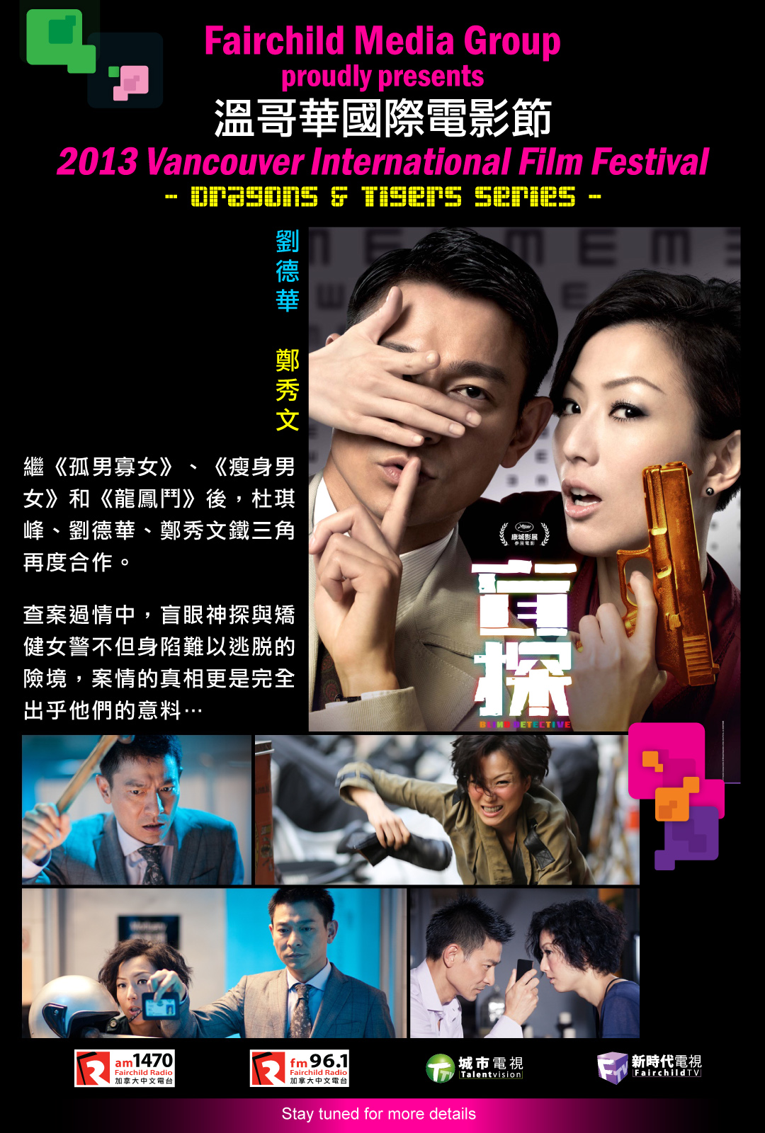 Dragon & Tigers Series 中的參展電影來自中港台日新亞洲等國家,當中讓人期待的包括杜琪峰、劉德華、鄭秀文鐵三角組合的《盲探》(香港)、劉嘉玲及陳坤的《過界》(香港)、軟硬及草蜢的《大戰》(香港)、張孝全及王羽的《失魂》(台灣)、賈樟柯的《天注定》(中國)、蔡明亮的《郊遊》(中國)、福山雅治的《我的意外爸爸》(日本)、松田龍平及宮崎葵的《字裡人間》(日本) 、崔岷植、李政宰的《新世界》(韓國)、陳哲藝的《爸媽不在家》(新加坡) 等,單看電影卡士陣容之強大,不難想像今年電影節的 Dragons & Tigers Series 將會非常精彩。想贏取免費溫哥華國際電影節入場券,就要鎖定 AM1470 及 FM96.1的節目。