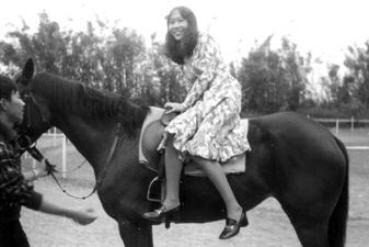 | hidden | ![]() 運動型的 Winnie 原來也有非常淑女的一面,連騎馬姿勢也斯文過人。 | hidden | ![]() 中學時攝於 Victoria 的立法大樓前,身栽高佻的她一派模特兒氣質。 |