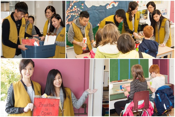 早餐的餐單雖然簡單,但營養十分豐富,有果汁、乳酪、麥包吐司,並有多款塗醬任君選擇,為了避免兒童對花生或果仁敏感,他們改用以豌豆做的 Wow Butter 代替之。為了讓小朋友有個不一樣的愛心早餐回憶,Jeffrey、Eva、Sam 和 Ginny 一邊派發早餐,一邊與小朋友說笑,不少小朋友胃口大開,要求「添食」,來個 second round breakfast!