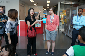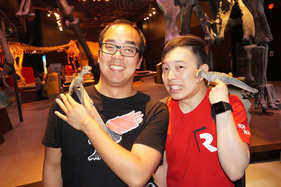 為了讓加拿大中文電台的參觀團能深入了解各種恐龍的特性,Science World 特別派出解說員 Rhoda Klein(第一張照片穿紅衣灰褲者)、宣傳負責人 Karthik Krishnaswamy(同一張照片穿淺藍襯衫之男士)和廣告公司代表 Annie Lee(穿黑衣之女士)全程陪伴及沿途講解。展覽方還十分明白孩子心理,在開始時即派發印章收集咭,鼓勵小朋友在會場內找出自蓋印章的六個地點,立即吸引了孩子們的注意,東張西望交頭接耳的商量:「There! There!」