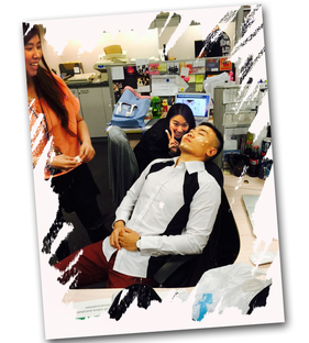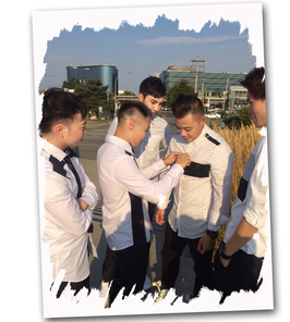 至於服裝,全部參照正版 MV,大部份還是五位 DJ 的私伙。但一時三刻要買齊和 MV 類似的衣裳實在困難,走投無路之際往往是創意發揮之時,最後還是用 DIY 的點子將問題解決。看看以上和以下的照片,你能看出拍《迷失 In U》時,五個人的白襯衫只有 Sam 和 Steven 的沒動過手腳嗎?Felix 胸前和肩上的黑色 strip、以及 BChiu 身上的黑色 cross 其實是 duct tape;至於 Reijen 的襯衫更複雜,肩上的兩塊黑色方塊原來是從一件黑色舊 t-shirt 中剪來縫上,完全是心機之作。
