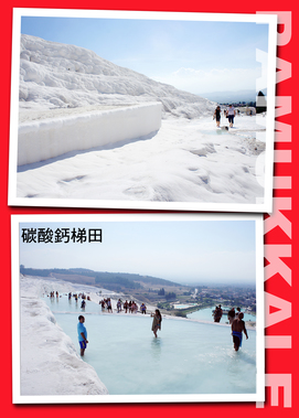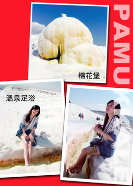 言歸正傳,說說棉花堡吧。看照片也許像雪地,其實它是由碳酸鈣的沉澱物積聚而成的,地上一球一球如棉花的,就是這些沉澱物,因此得名棉花堡。這裡從地下冒出來的水就是含碳酸鈣的溫泉水,對皮膚很有好處,所以大家都把鞋脫掉享受溫泉足浴,不過這個碳酸鈣的地貌已逐漸在地球上消失,好可惜啊。