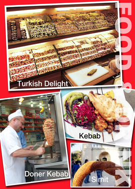 主食方面土耳其菜屬地中海系,很多燒烤菜,但因為它的國民九成以上是回教徒,所以豬肉不多見。他們的蔬菜也跟我們的不一樣,會經常吃紅菜頭和長辣椒,另外又會在街上叫賣烤玉米和烤粟子,完全中國風。這裡還有一種像 pretzel 的麵包叫 Simit,也是在街上隨處有賣。