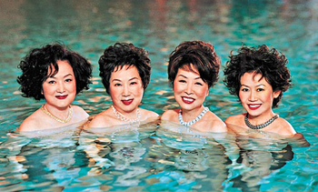 | hidden | ![]() 1997 年,(左起)吳鶯音、靜婷、崔萍、劉韻,舉行了「金光燦爛耀舞台演唱會」,叫好又叫座。 | hidden | ![]() 意猶未盡,1998 年的「金光燦爛再耀舞台演唱會」,加入了蓓蕾,四位元祖級樂壇天后包括(左起)劉韻、吳鶯音、靜婷、蓓蕾,跳入泳池拍了這張「艷照」,哄動一時。可惜老大姐吳鶯音在 2009 年以 87 歲高齡仙遊,此情不再。而劉韻其實就是華娃的親姐姐。 |