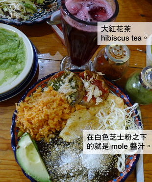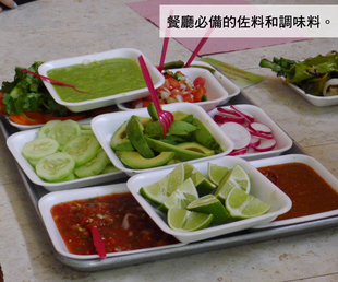 很多人以為墨西哥菜偏向重口味,其實大部份的墨西哥菜都很清淡,重口味的是澆在食物上面的 mole 以及各式佐料和調味料。文楓說每到一家餐廳用餐,侍者都會拿出很多小碟的佐料和沾醬,包括青檸、牛油果、青瓜、蕃茄、洋蔥、紅辣椒、青辣椒、芫荽、salsa、guacamole 等等,再加上鹽和胡椒,真是甜酸鹹辣甘,悉隨尊便。