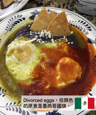 Mole 因為材料不同,顏色由白、黃、橙、啡甚至墨黑都有。墨西哥早餐有一樣名為 divorced eggs,其實只是普通的煎雙蛋,但因為在白色的煎蛋兩旁澆了綠色和紅色的 mole,令它看起來好像勢不兩立。但用綠、紅兩種顏色的原意是令這道菜看起來像墨西哥國旗(從左到右是綠、白、紅),將「愛國的蛋」變成「離婚的蛋」,各位也太愛搗蛋了吧?
