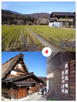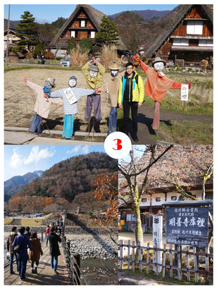 一覺醒來是個晴朗的早上,BChiu 等一行人開始了昇龍道的旅程,坐了 3 小時的車來到歧阜縣飛驒地區的白川鄉合掌村,這是遊客必訪之地,除了因為整個村落是世界文化遺產,還因為在這裡可領略到純樸典雅的日本農村風情。合掌村位於群山深處,村內集合了一百多座其他地方難得一見的合掌式房屋,合掌房屋奇妙之處,是全木制的建築完全不用一釘一鉚,榫卯對接,再用繩子紮結而成,而屋頂則先將茅草捆紮成一大束,再一束一束、一層一層鋪就。屋頂之所以做成尖三角的形狀(45° 至 60°),是為了能在冬季不積雪,夏季不悶熱,可見先人之智慧。其實溯流追源,合掌村是在 13 世紀初,平氏一族為了逃避敵人追殺而躱進深山穩居,當時的打算,是如果敵人追來,那沒有用到一釘一鉚的木屋,可以隨時拆走。現在合掌村的部份民房已被改建成咖啡館、精品店或民宿,但仍然有人務農為生。到合掌村參觀,首先會經過一道「相逢橋」,之後會見到錯錯落落的農田和合掌屋,如果想參觀合掌屋的內部,可以購票進入歷史最悠久的「和田家」(1573 年起就在這裡居住)和「明善寺庫裡」(村裡最大的合掌式建築)。「合掌村的範圍不是很大,卻很寧靜和平,連河水都特別清澈;加上沒有現代化建築物,連消防局也是合掌式房子,令人有一種時間停頓的感覺。」