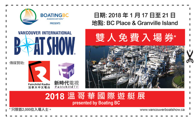 The Vancouver International Boat Show 2018 is taking place from Jan 17 to 21 at both BC Place (for indoor exhibition) and Granville Island (for outdoor floating boat show). Fairchild Radio AM1470 and FM961 is giving away free admission tickets to the show this week. You can also print out the following coupon to redeem for TWO FREE ADMISSIONS, but only for the first 2,000 visitors to the show.