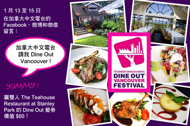 由 1 月 13 日至 15 日,只要你在本台的 Facebook、微博和微信留言「加拿大中文電台請我 Dine Out Vancouver!」(請一字不漏照抄),即有機會參加大抽獎,贏取 The Teahouse Restaurant at Stanley Park 的 Dine Out Vancouver 餐券兩張,午晚餐任擇,由 1 月 19 日至 2 月 4 日有效,價值 $60*。