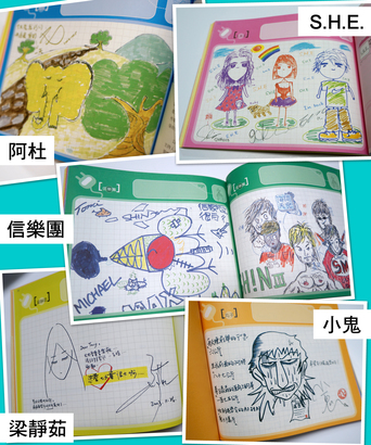 | hidden | ![]() Tracy 收集了數百張歌手明星的塗鴉作品,精選了其中的五十,出版成書。周杰倫畫的是一個小女孩,因為買不到周杰倫的新專輯而愁眉不展;李聖傑畫的小男孩把心捧在手上,癡心一片;五月天多次受訪,曾畫過把時鐘頂在頭上的時光小子,又畫過代表五位一體的 rock and roll 手勢。 | hidden | ![]() 阿杜每次上「吹吹音樂風」畫的都是大象,說這是代表他靈性的動物;S.H.E. 的畫風很少女,但細看之下發覺三位成員的性格全然不同;信樂團很熱鬧,五個人邊玩邊畫,互相調侃;梁靜茹的畫風一如她的唱歌風格,很安靜很療愈;至於小鬼,畫的是一個收到退學令的人被嚇到冒汗,極具喜劇效果。 |