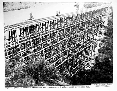 | hidden | ![]() 鐵路不少部份都是靠打穿山腳開出一個洞才能建成,工程浩瀚。(City of Vancouver Archives AM54-S4-: Can P186.4) | hidden | ![]() 當年溫哥華四百公里範圍內最高之鐵路木棧橋。(Vancouver Public Library Special Collection 242) |