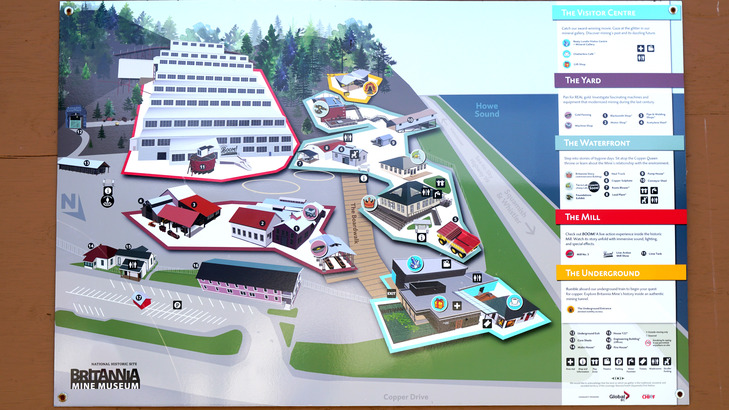 | hidden | ![]() Britannia Mine Museum 是體驗式的博物館,面積達 10 英畝。地圖右下角(淺藍區)是 Visitor Centre,有餐廳及禮品部。左上角的建築物就是 Mill 3(3 號流水淘礦廠),遊客可以身臨其境感受當年礦工工作的環境。Mill 3 之下(酒紅區)是 The Yard,展示採礦和淘金的設備,並有淘金體驗區讓遊人嘗試淘金。至於地下的礦洞遊,則集中在右上角(黃區),遊客可乘坐小火車深入礦洞。 |