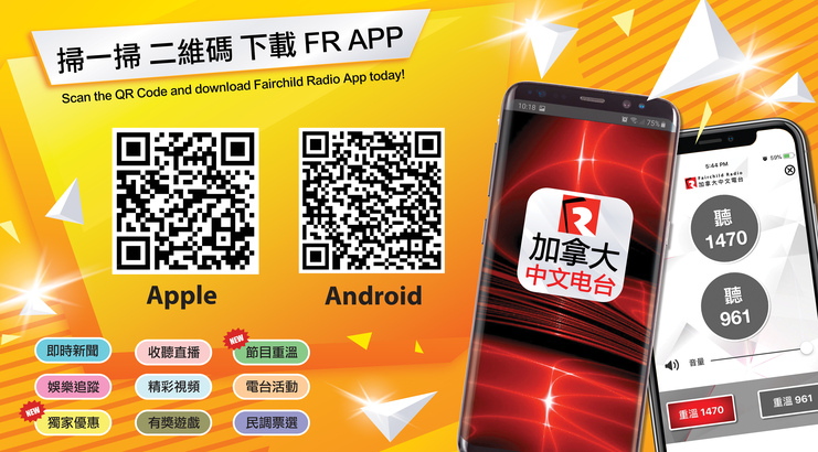 下載加拿大中文電台手機 App 非常簡單,只需以閣下手機的鏡頭對準以下圖片中 Apple 或 Android 的專屬二維碼(QR Code),對焦後,大部份手機都能即時連結至 Apple App Store 或 Google Play 的 Fairchild Radio App;大家亦可以在 Apple 的 App Store,或 Android 的 Google Play 中搜尋「加拿大中文電台」或「Fairchild Radio」,以上兩種方法都能即時免費下載。