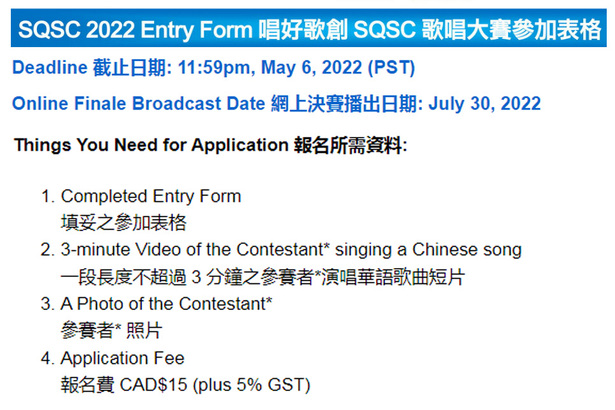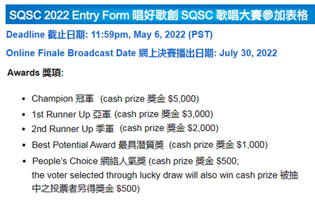 Joining the Canadain Chinese Song-Writers Quest Singing Contest 2022 (SQSC 2022) is your best opportunity to win cash prizes this summer! No matter where you live in Canada, as long as you are a Canadian Citizen, Premanent Resident or Landed Immigrant, you are entitled to enter this once in a lifetime singing competition. Click the links above to learn more and apply @ SQSC 2022 offical website.