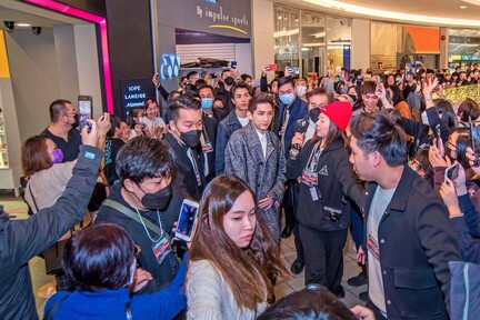 | hidden | ![]() 單單從電台步出,以電動樓梯走到時代坊中庭舞台的幾分鐘路程,大會出動了十名保安員和 MakerVille 的所有工作人員護航。 | hidden | ![]() 步下電動樓梯時,有人高叫「李承東」和「歐陽駿」,也就是 Lokman 和 AK 在《繩角》中角色的名字,還有粉絲帶同紅色拳套要和兩位 fist bump。 |