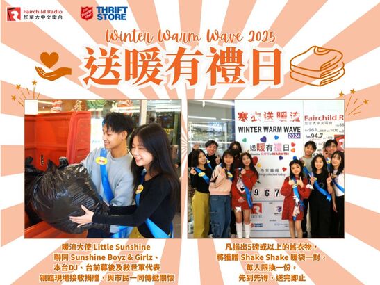 自1995年首次舉辦以來,「寒衣送暖流」已成為大溫地區最具代表性的愛心活動之一,累積無數善長的溫情捐贈,讓社區充滿關懷。今年,我們迎來活動的第31屆,更希望藉此讓愛心延續、讓暖意加倍。 為了使更多人輕鬆參與,今年「寒衣送暖流」除了設置多個收集點外,大受歡迎的「到你家收寒衣」服務亦再度回來,讓年長者、行動不便或缺乏私人交通工具的朋友,也能在家輕鬆回饋社會。