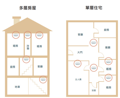 • 為確保安全,請在每個睡房分別安裝煙霧警報器。