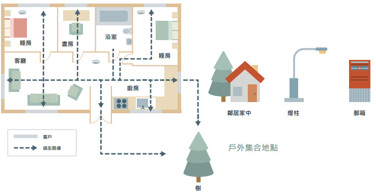 2. 為每個房間規劃兩條逃生路線。主要逃生路線的出口一般是門口,其次是窗戶。確保所有窗戶均易於開啟。