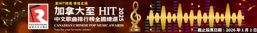 2025年香港樂壇以多元創作和動人歌聲療癒大家,每一首歌、每一位音樂人的真摯作品,陪伴著你我一起走過365天。面對年底的災難,大家心情忐忑起伏,但願能以音樂發揮支持與連結的力量。 由加拿大中文電台(溫哥華 AM1470 / FM96.1、卡加利 FM94.7、多倫多 AM1430 / FM88.9)主辦,加國最具代表性的粵語樂壇指標 —— 「加拿大至 HIT 中文歌曲排行榜 2025 全國總選」 已經展開,讓樂迷以實幹而真摯的方式支持音樂人。截止投票日期: 2026 年 1 月 2 日。